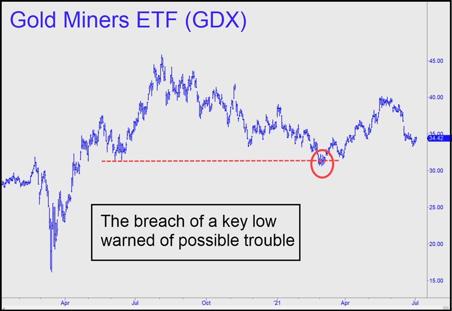 So what changed my mind? I'd like to say that fresh evidence on the charts swayed me. In fact, I actually ignored a flashing-yellow signal early in March, when GDX, the gold miners ETF, breached a key low at 31.22 from nine months earlier. This is shown in the chart, and it created a glow-in-the-dark 'impulse leg' that was unmistakably bearish. Unfortunately, my focus was elsewhere, mainly on a few subjective factors that were bound to mislead anyone looking for a long-elusive ray of sunshine in precious metals. For one, I noted, bitcoin was finally getting its comeuppance, presumably freeing up speculative energy for bullion. And for two, there had been no vicious takedowns in gold recently, ostensibly because the bad guys finally realized it was time for gold to start discounting the rising crescendo of inflation fears. I was wrong on both counts, for gold and silver were about to get hit with their steepest two-day sell-off since November. Further selling mercifully stalled, but the jury is still out on whether another wave is coming.