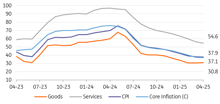 Services inflation, which is less affected by currency fluctuations but more influenced by domestic demand and minimum wage increases, continued to decline. It dropped to 54.6% YoY, marking the lowest level since summer 2022 thanks to further easing in rents.