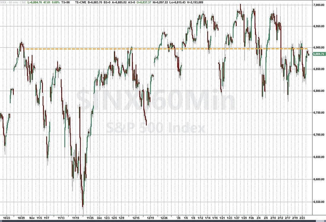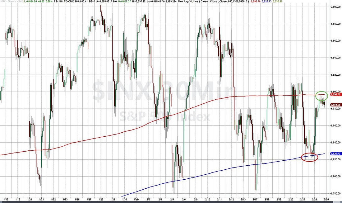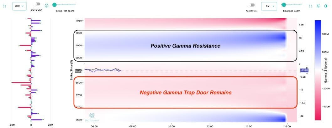 Technically, the 6800 to 6900 zone continues to anchor the S&P. Below that lies the trap door of negative gamma where moves can accelerate. Above it sits a wall of positive gamma that encourages mean reversion and caps breakouts.