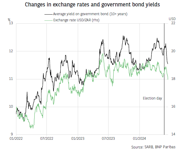 Political uncertainty has reduced following the general elections on 29 May. So far, the financial markets have reacted positively to the formation of a Government of National Unity (GNU) composed of the ANC, the Democratic Alliance (DA) and the Inkatha Freedom Party (IFP). After 30 May, the average yield on 10-year government bonds fell by 4.2% and the South African rand (ZAR) appreciated by 4.1% against the dollar. It then fell below the threshold of 18 ZAR/USD for the first time since the beginning of the year.