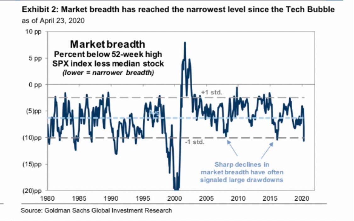 The S&P 500 is comprised of 500 shares, not all of the equal size. At the time Goldman Sachs performed the research, the S&P 500 was 17% below its record high in February, but the media stock traded some 28% off the peak. That means that a small number of shares – such as Amazon, which is having a good crisis – are carrying the weight.