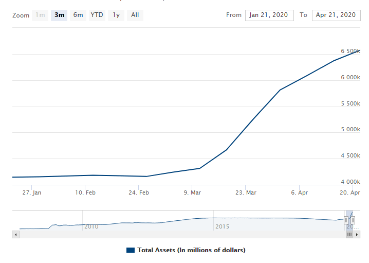 The post-crisis peak stood at roughly $4.5 trillion after several rounds of QE that lasted years. Some of the $2.5 trillion of new money created within six weeks spilled into equity markets and certainly helped boost sentiment.