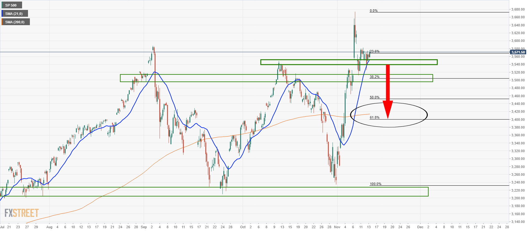 The sellers have filled the bids back to liquidity for a 38.2% Fibonacci retracement and to the support of the 4-hour chart's 21-period moving average: