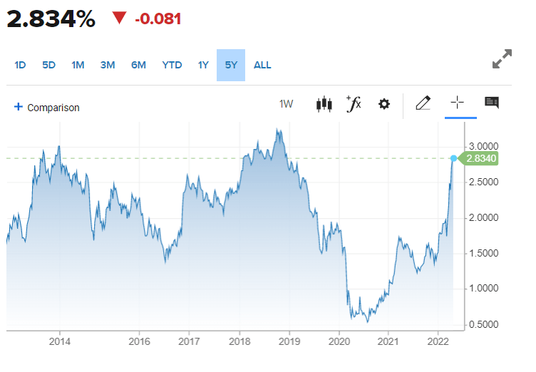 Federal Reserve rate policy is another building impediment to business expansion. The Fed’s own March estimates have the fed funds rate at 1.9% at the end of the year, 150 basis points higher than its current 0.5%. Treasury futures rate the odds of a 3.0% fed funds rate after the December 14 FOMC meeting at just over 50%. The commercially relevant 10-year Treasury yield has jumped 133 basis points this year to 2.834% and is now at the high end of its 10-year range.