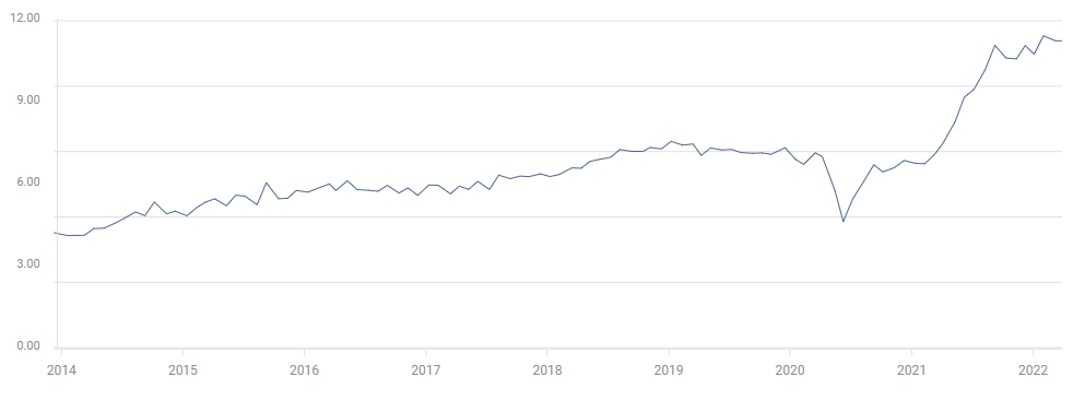 Overall CPI, 8.5% in March, has set a new 40-year high for each of the last four months. This will probably accelerate in the second quarter as business price increases have reached double digits, with the Producer Price Index (PPI) soaring an all-time record 11.2% on the year in March. In the current product and labor scarce economy, manufacturers and businesses will not hesitate to pass cost increases on to their customers.