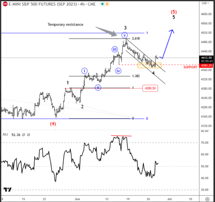 SP500 keeps moving higher but its showing five waves up unfolding from 4160 area so can be final leg of a higher degree structure, meaning we should be aware of a potential limited upside. However, the rise has been strong since the start of June so current pullback is normal and ideally it's wave 4 now testing a key support around 4380 from where traders can be aware of another leg higher while price is above 4280.