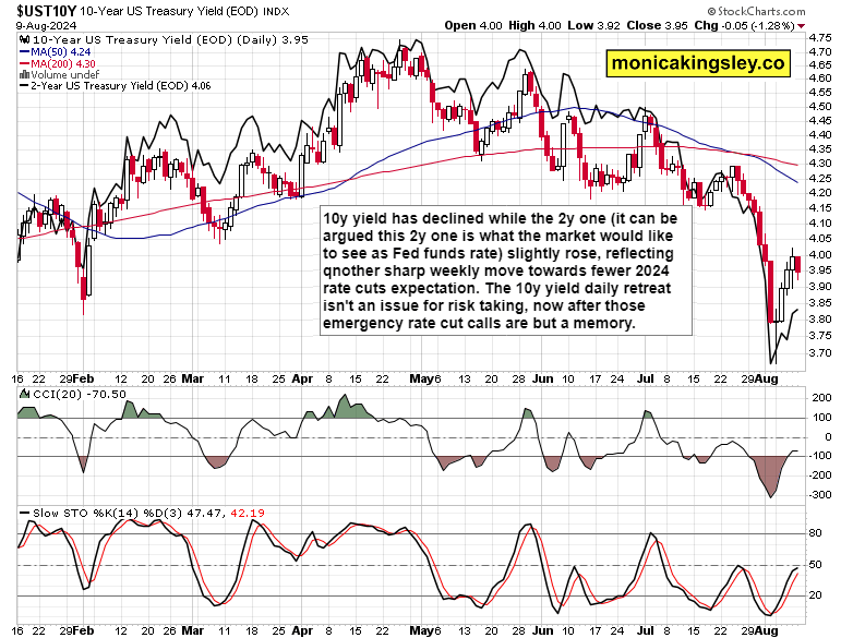 Sure, rotation is there – this theme of broadening market breadth ever since the steep recalibration of Jul CPI, is there. In the short-term though, the most interest rate sensitive plays have to wait as good economic news is good for stocks, and slow rise in bond yields isn‘t an issue – the yield curve briefly stopping being inverted, isn‘t concerning as we enter a new week with big inflation data.