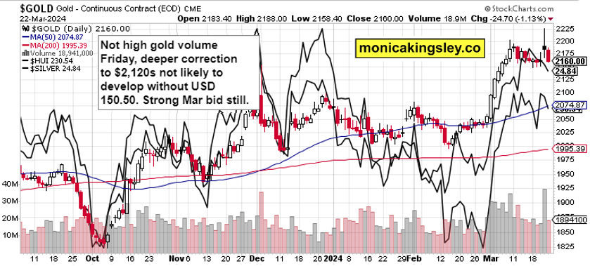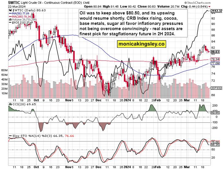 Oil didn‘t really move much Friday, and the declining volume favors upswing in real assets (precious and base metals alike) starting next week. It‘ll be happening alongside the dollar not yet rolling over to the downside.