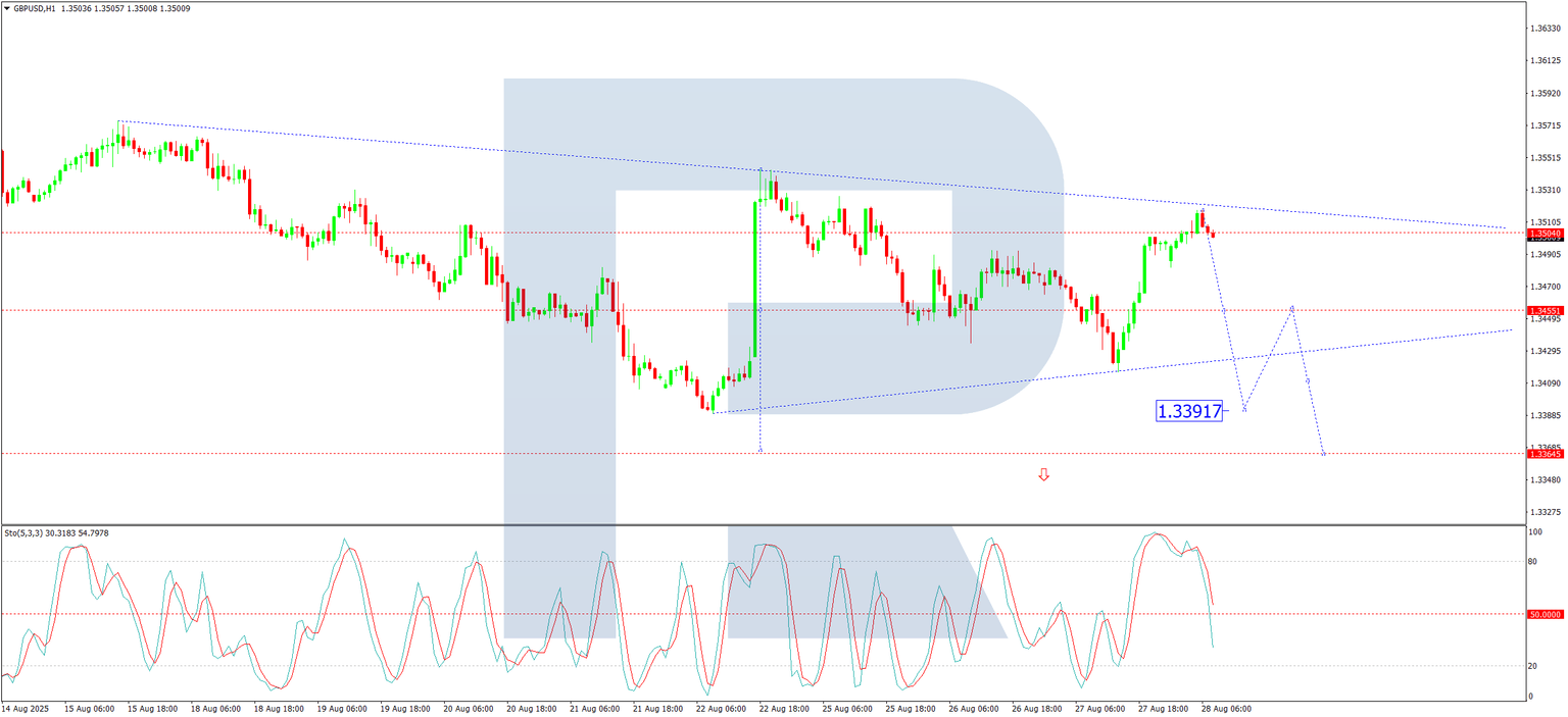 On the H1 chart, the market formed a downward wave structure towards 1.3417, which was followed by a corrective wave to 1.3517. The current expectation is for the initiation of a new declining wave towards 1.3455, with the potential to extend the downward structure towards the 1.3390 level. This scenario is technically corroborated by the Stochastic oscillator. Its signal line is currently below the 80 level and is trending sharply downwards towards 20, indicating strengthening bearish momentum.