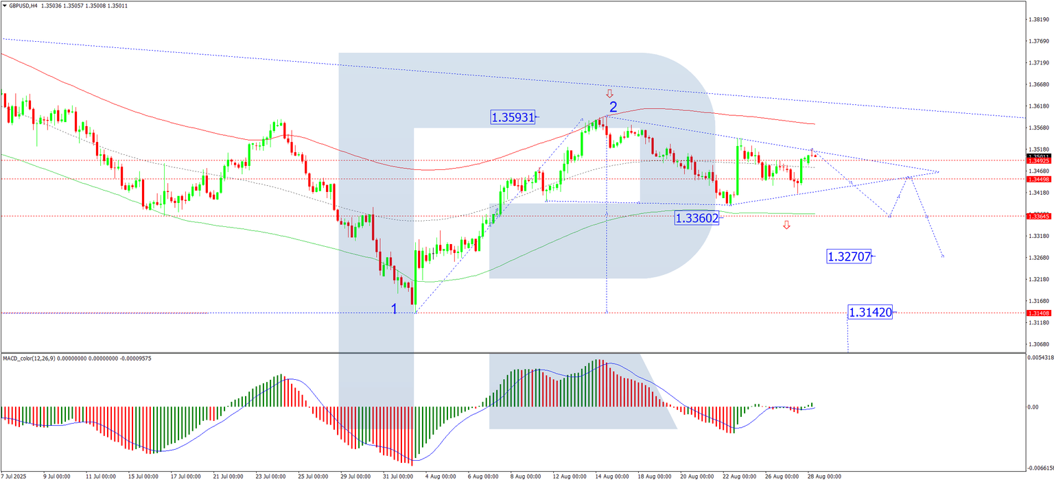 On the H4 chart, the GBP/USD pair completed a downward impulse wave to the 1.3420 level, followed by a corrective bounce to 1.3515. The market continues to develop a consolidation range around the 1.3455 level. The primary scenario for today is a resumption of the downward wave towards the 1.3360 support. A decisive break below this level would open the potential for a further decline towards the next downside targets of 1.3270 and 1.3140. This bearish outlook is technically supported by the MACD indicator, whose signal line remains below zero and is pointing sharply lower.