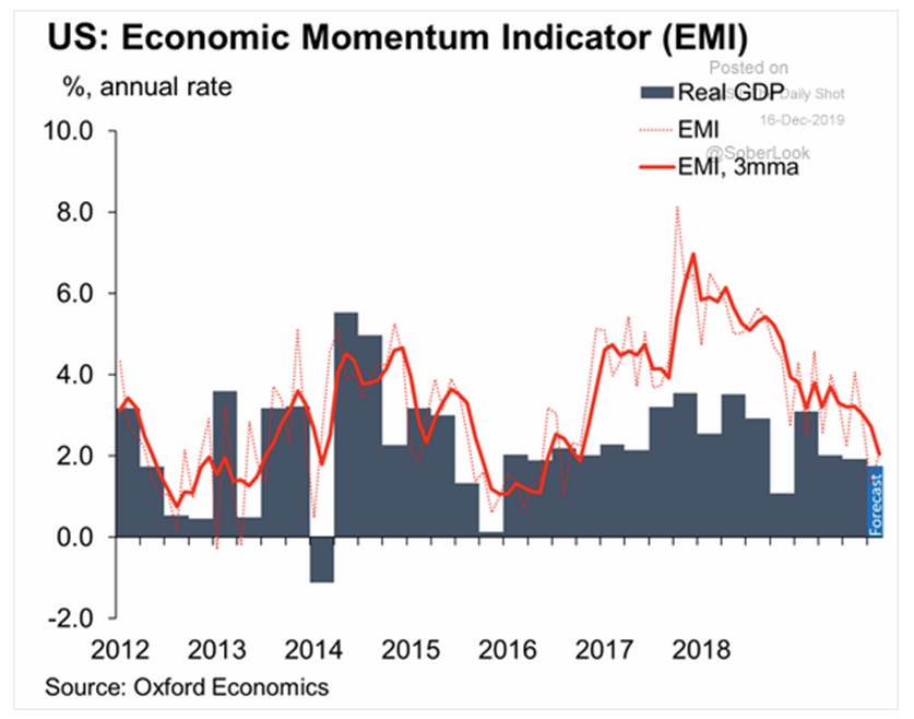 Then there is the momentum idea from Oxford Economics. We don't know how this is calculated but it has the ring of truth about it. The chart is from the Daily Shot.