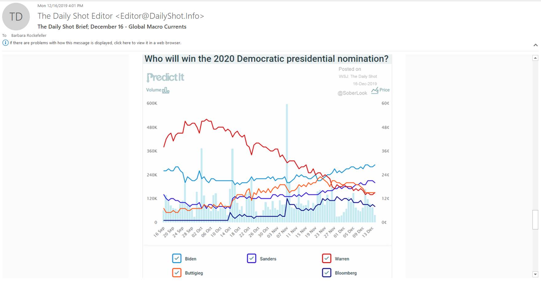 According to betting at PredictIt, the Democratic candidate will be Biden. He is gaffe-prone, out of date, and uninspiring to the younger set—his bus has the motto "No malarkey!" for heaven's sake. But no one doubts his honesty, understanding of the concept of public service, and sincerity on civil rights, and he can bring out the black vote. It's too early to talk about the final contender, but if it's Biden, that means the VP spot must be a woman, a black or the gay guy. Kamala Harris, who dropped out a few weeks ago, qualifies on two minority points. We'd rather see her as Attorney General indicting the pants off Trump and Booker as VP, but that would put two sometimes tongue-tied guys up there. Klobuchar and Mayor Pete would do just fine, too. Whatever. It will be a battle of the decent against the indecent.