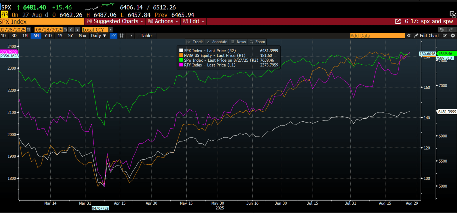 Chart 1: Nvidia, the Russell 2000, the S&P 500 and the equal-weighted S&P 500