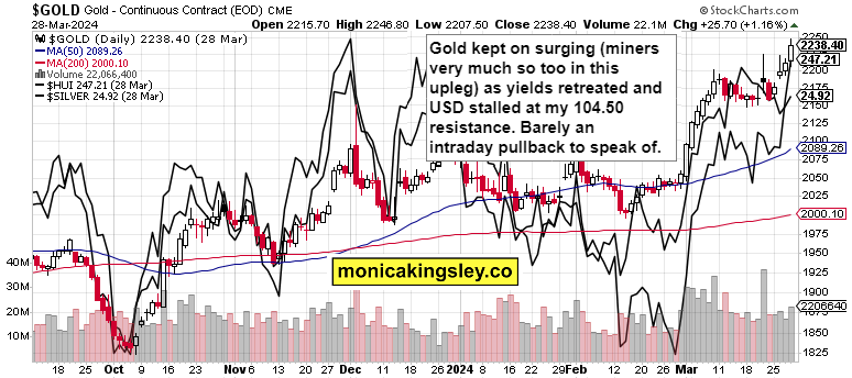 Gold did shake off hot GDP with ease, and overcame first $2,230 and then $2,240 following intraday consolidations. The upswing won‘t be materially dialed back unless Powell starts tightening the screws (unlikely) – intraday flushes are still to be bought as USD sits on 104.50 resistance, and I don‘t see much fresh hawkishness propelling it higher. With 10y yield rising to 4.59, watch out for a gold range to develop, with $2,230 being the short-term floor not in immediate jeopardy.