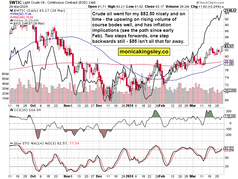 The pause button is hitting the rally, and even before the core PCE data, Bitcoin (crypto were the only market open on Easter Friday) was pointing lower. Then the data came, largely in line with expectations, but that‘s still enough to question the pace of disinflation and progress towards the Fed‘s still valid 2% goal. Forget not that the oil upswing I had been calling for, this rise since early Feb, is to still show up in future inflation data.