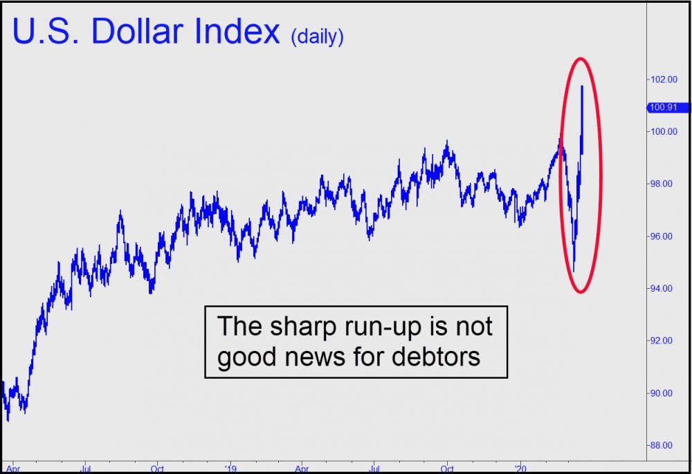 This is just one of many reasons why a hyperinflation is not coming. Set against them is the entrenched belief that the Fed would never let deflation happen. Well, the dollar, along with the real burden of debt, soared on Wednesday -- this despite the fact that President Trump was offering up a trillion dollar stimulus in an attempt to offset economic damage from the pandemic. Ordinarily we would have expected the dollar to reel from what amounted to the most powerful inflationary shock it has ever received; instead, it rose sharply. This was a wake-up call not only for the fools who still believe the Fed is all-powerful, but for those who think that debt doesn't matter.