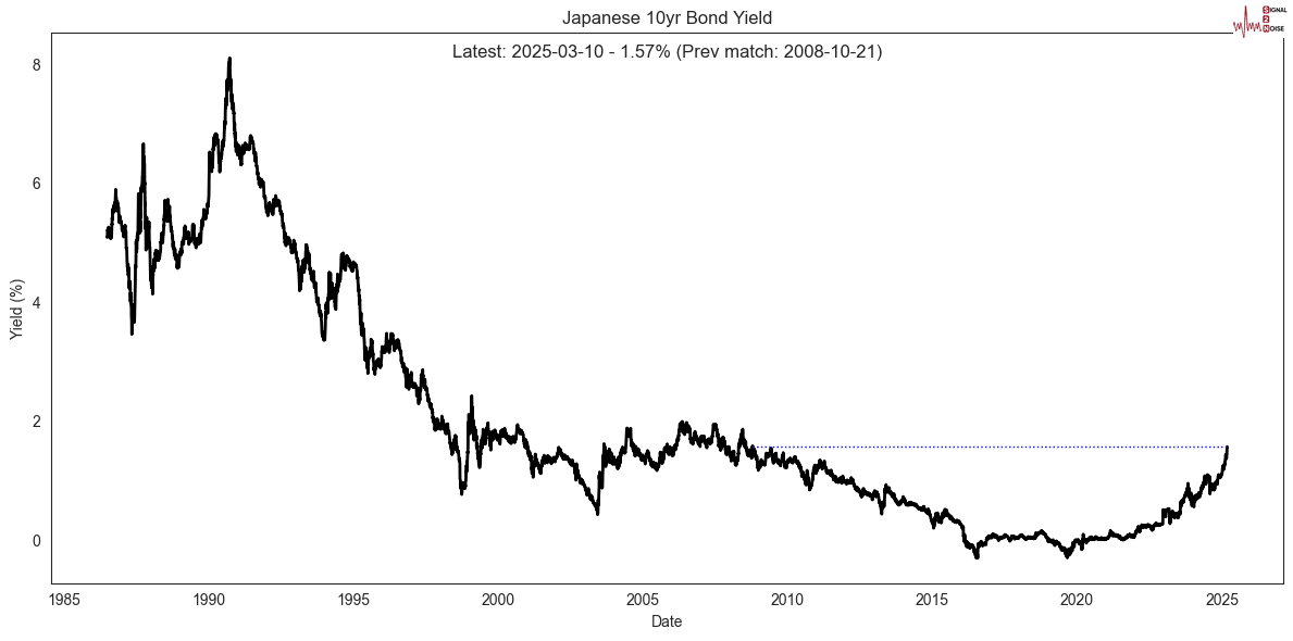 In the land of the rising sun, we have a 10-year bond yield rising to levels last seen in October 2008: 1.57%.