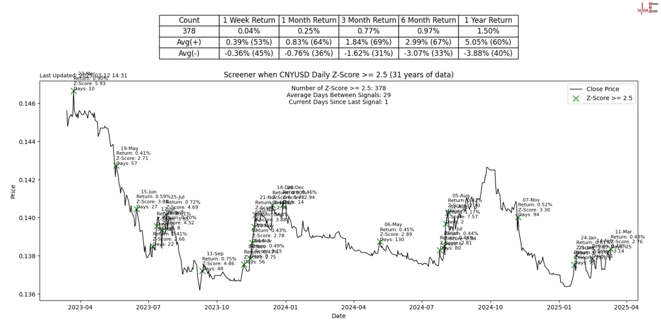 China’s renminbi had a strong flex against the dollar yesterday with a 2.5 sigma up day.
