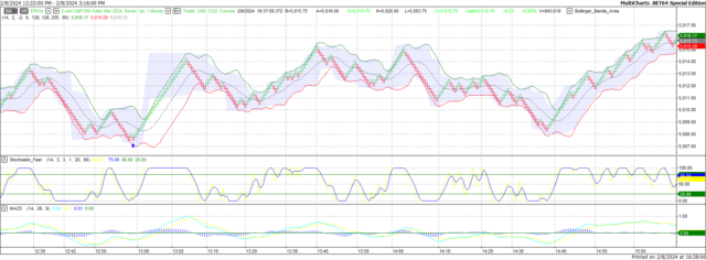 Yesterday the ZN migrated Lower at around 1 PM EST as the S&P hit a Low at around the same time. If you look at the charts below the S&P gave a signal at around 1 PM and the ZN started its Downward trend. Look at the charts below and you'll see a pattern for both assets. S&P hit a Low at around 1 PM and migrated Higher. These charts represent the newest version of MultiCharts and I've changed the timeframe to a 15-minute chart to display better. This represented a Short opportunity on the 10-year note, as a trader you could have netted about 20 ticks per contract on this trade. Each tick is worth $15.625. Please note: the front month for the ZN is now Mar '24. The S&P contract is now Mar' 24. I've changed the format to filled Candlesticks (not hollow) such that it may be more apparent and visible.