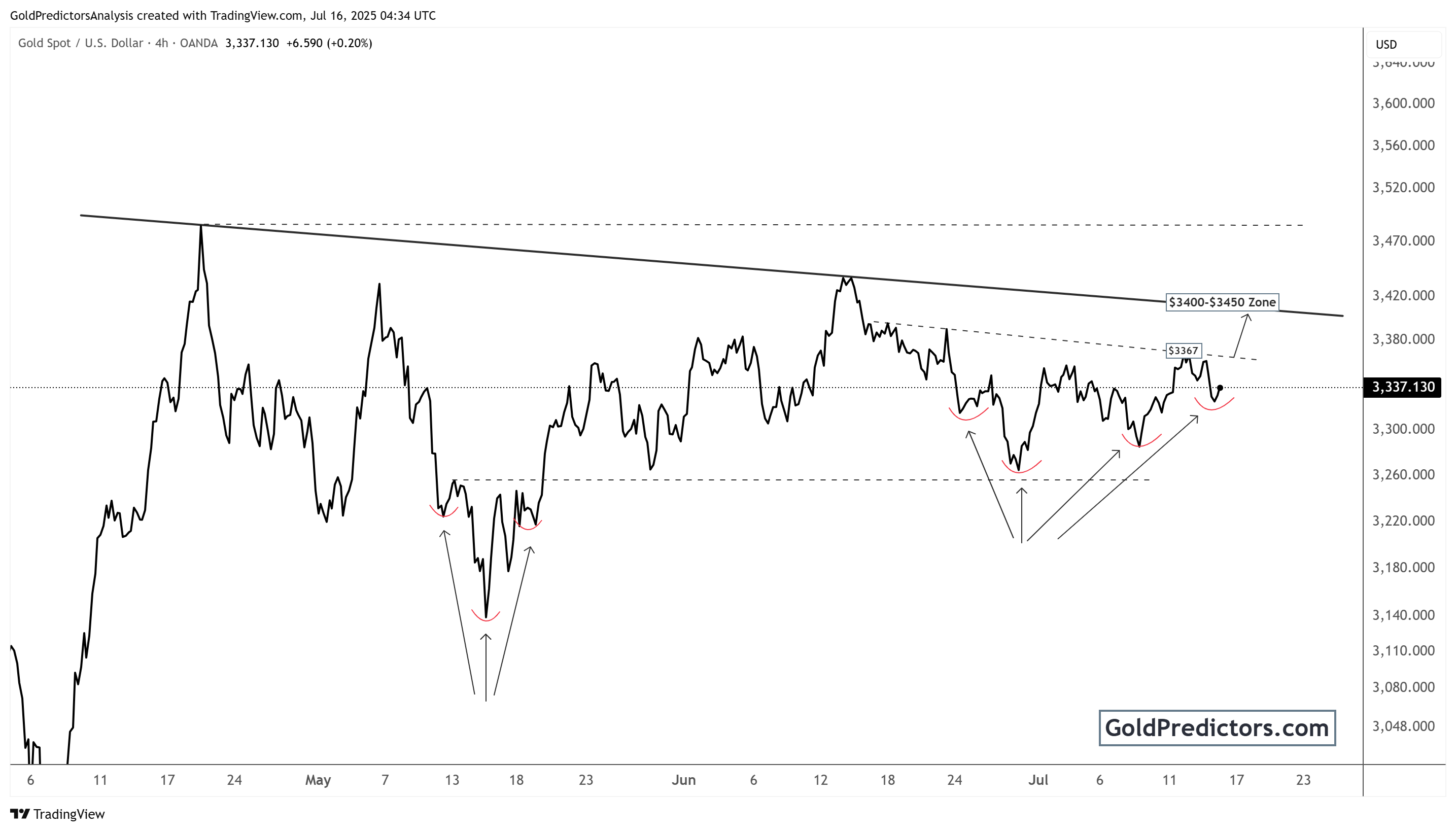 Gold is currently consolidating just below this neckline at $3,337. A breakout above $3,367 could confirm the pattern and trigger fresh buying interest. The next target lies between $3,400 and $3,450. This area also aligns with the upper boundary of the broader descending resistance trendline drawn from May highs.