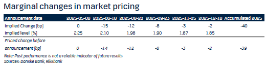 FI. Market pricing has been roughly unchanged following the announcement, with 2bp added to Riksbank pricing for this year. The June meeting is priced at 15bp, which again, looks excessive in our view and IF a cut is delivered, it seems more likely in August or September as we see it.