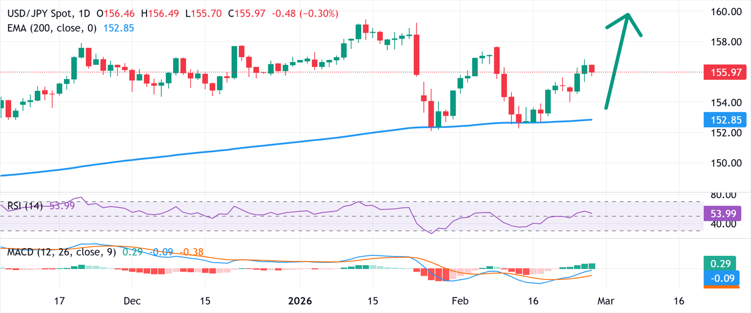 The recent repeated rebounds from a technically significant 200-day Exponential Moving Average (EMA) favor the USD/JPY bulls. This sets the stage for a move beyond the recent swing high, towards testing the intervention threshold level near the 160.00 psychological mark.