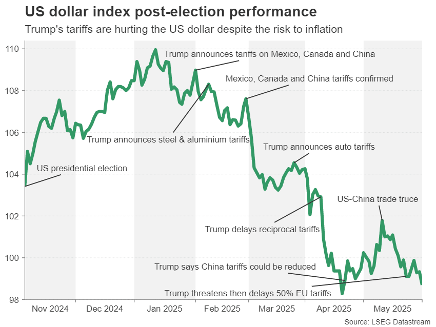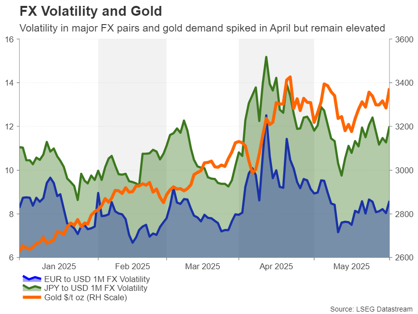 Moreover, one-month implied volatility rates for EUR/USD and USD/JPY have not declined as much as the VIX has since the April spike, underlining the nervousness in the broader markets about the tariff impact. The same is also true for the popular safe-haven gold, which has rallied by more than 25% so far in 2025 and it’s approaching its record high from April.