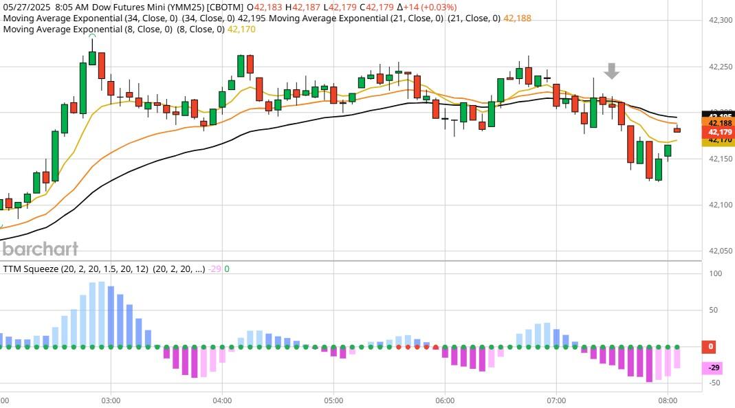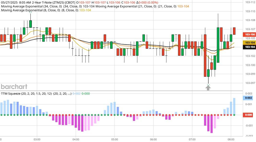Yesterday the ZT climbed Higher at around 8:30 AM EST after the Durable Goods numbers were released. The Dow dived Lower at the same time. Look at the charts below and you'll see a pattern for both assets. The Dow moved Lower at 8:30 AM EST and the ZT climbed Higher at around the same time. These charts represent the newest version of Bar Charts, and I've changed the timeframe to a 15-minute chart to display better. This represented a Long opportunity on the 2-year note, as a trader you could have netted a dozen plus ticks per contract on this trade. Each tick is worth $6.25. Please note: the front month for ZT is now Jun '25 and the Dow is Jun '25 as well. I've changed the format to filled Candlesticks (not hollow) such that it may be more apparent and visible.