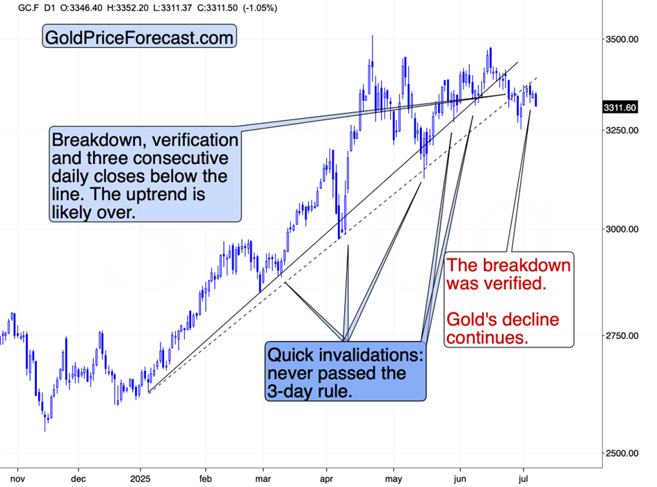 Again, this is not a short-term signal (I covered this on the first chart) – this is a huge, long-term red flat that we saw here. My gold price prediction for July 2025 is therefore bearish.