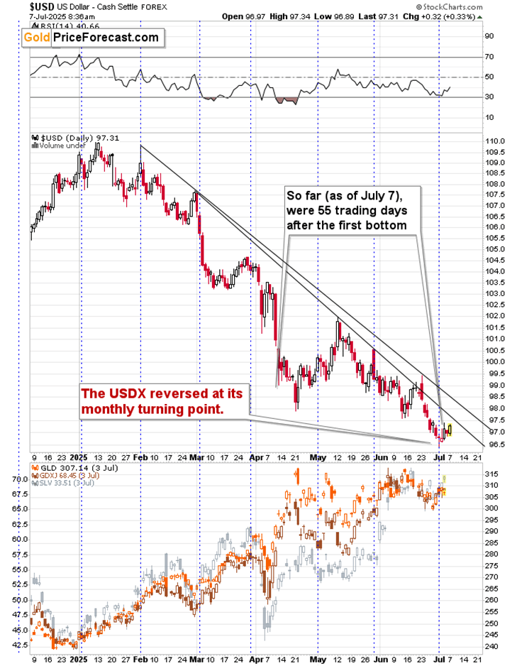 While gold and miners verified their breakdowns, the USD Index appears to have bottomed in tune with its monthly turning point.
