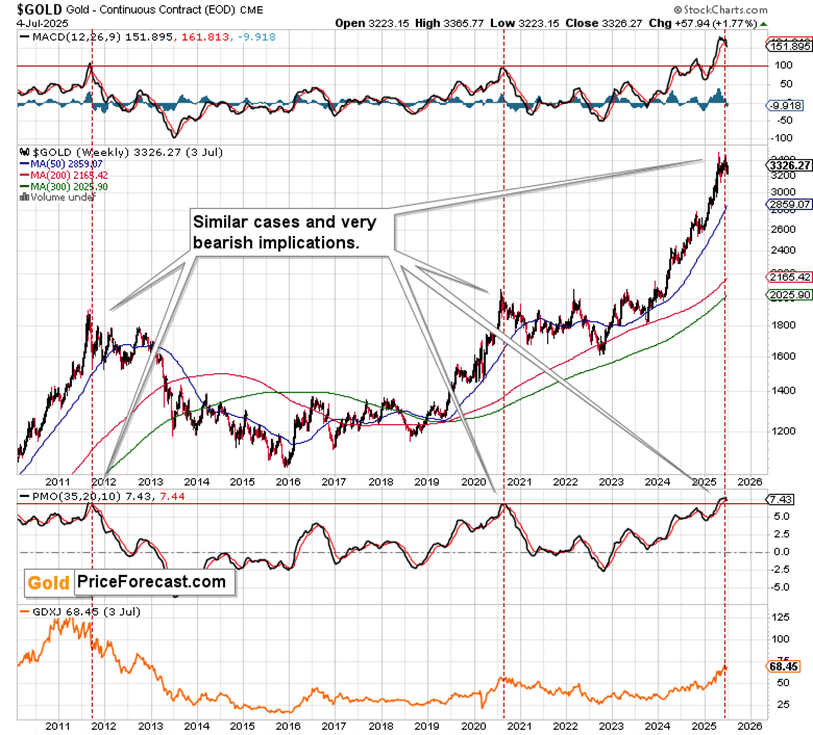 MACD based on weekly gold prices got more overbought than at the 2011 top, while the PMO got similarly (extremely) overbought. The only other case that’s similar is the 2020 top.