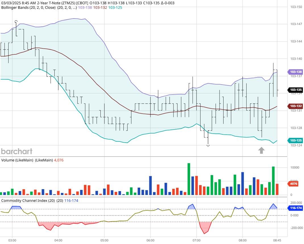 Yesterday the ZT Migrated Higher at around 8:15 AM EST with no economic news reported. The Dow moved Lower at the same time. Look at the charts below and you'll see a pattern for both assets. The Dow moved Lower at 8:15 AM EST and the ZT moved Higher at around the same time. These charts represent the newest version of Bar Charts, and I've changed the timeframe to a 15-minute chart to display better. This represented a Long opportunity on the 2-year note, as a trader you could have netted about a dozen ticks per contract on this trade. Each tick is worth $7.625. Please note: the front month for ZT is now Jun '25 and the Dow is still Mar '25. I've changed the format to filled Candlesticks (not hollow) such that it may be more apparent and visible.