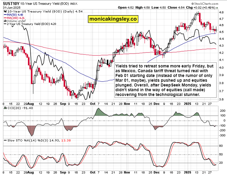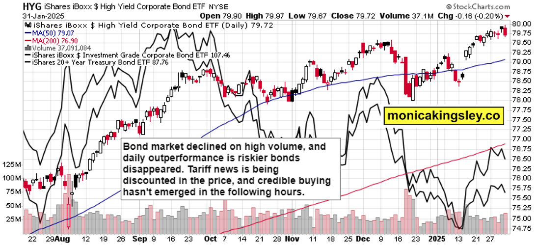 S&P 500 was drifting higher premarket, waving off the tariff threat before the weekend with a mainstream article talking newly about Mar 01 deadline, and not this weekend implementation (with China 10% on top) – forcing a reversal in stock market path. With both Canada and Mexico accepting the challenge with counter tariffs of their own (Canada eyeing TSLA, too), and China as well taking countermeasures and going the WTO challenge route, the path is set for a bearish gap Monday open the way it was the case the week before with DeepSeek. See Bitcoin below $100K, and remember how it was a week ago.