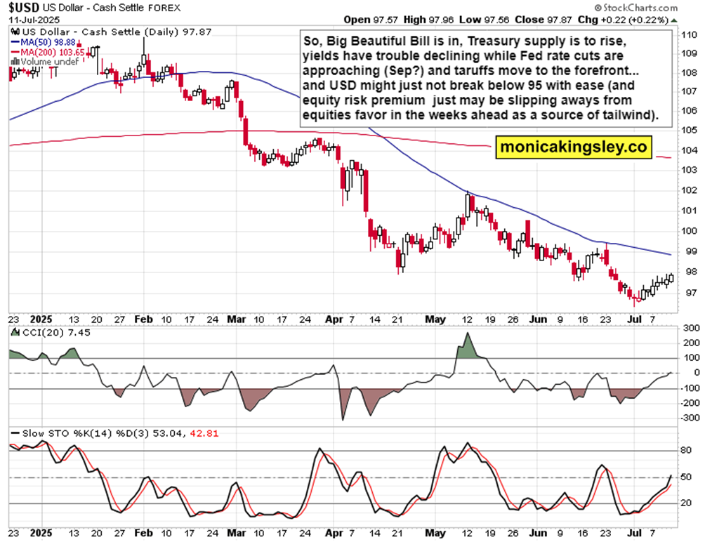 Rate cuts are coming, just not in Jul – I favor Sep way more as tariff impact on inflation will be more readily apparent to the data-dependent Fed – and USD with yields are starting to paint a certain picture (have yields gone up when tariff wars first entered headlines? Would the USD move now support risk-on, are we seeing domestic stocks, smallcap somewhat insulated?) that I‘m also discussing in the latest video.