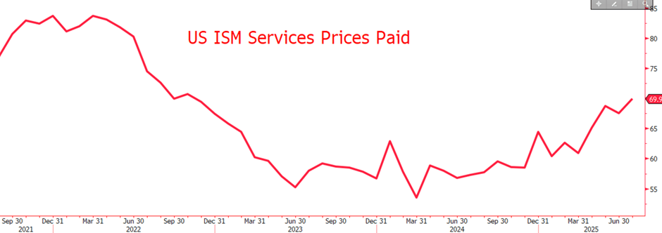 Almost as if one cue, ISM PMI data released, showing the service sector putting out a below expectations performance in July. More interesting however, was the prices paid data, showing that even though there are now tariffs on services, the highest rate of price inflation since 2022.