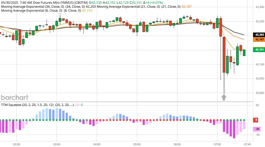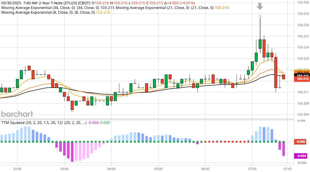 On Friday the ZT climbed Higher at around 7:30 AM EST with no real news to speak of. The Dow dived Lower at the same time. Look at the charts below and you'll see a pattern for both assets. The Dow moved Lower at 7:30 AM EST and the ZT climbed Higher at around the same time. These charts represent the newest version of Bar Charts, and I've changed the timeframe to a 15-minute chart to display better. This represented a Long opportunity on the 2-year note, as a trader you could have netted about 20 plus ticks per contract on this trade. Each tick is worth $6.25. Please note: the front month for ZT is now Sep '25 and the Dow is still Jun '25. I've changed the format to filled Candlesticks (not hollow) such that it may be more apparent and visible.