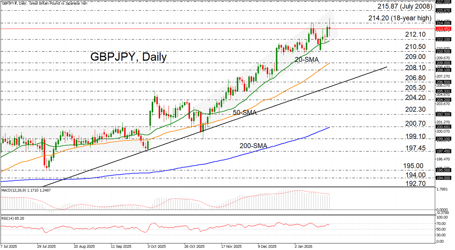 However, if the rejection from multi-year highs extends, initial support is expected at 212.10, which is near the 20‑day SMA. Below that, support lies at the monthly lows near 210.50, the 50‑day SMA around 209.00, and 206.80 – a break of which would shift the broader bias to neutral.