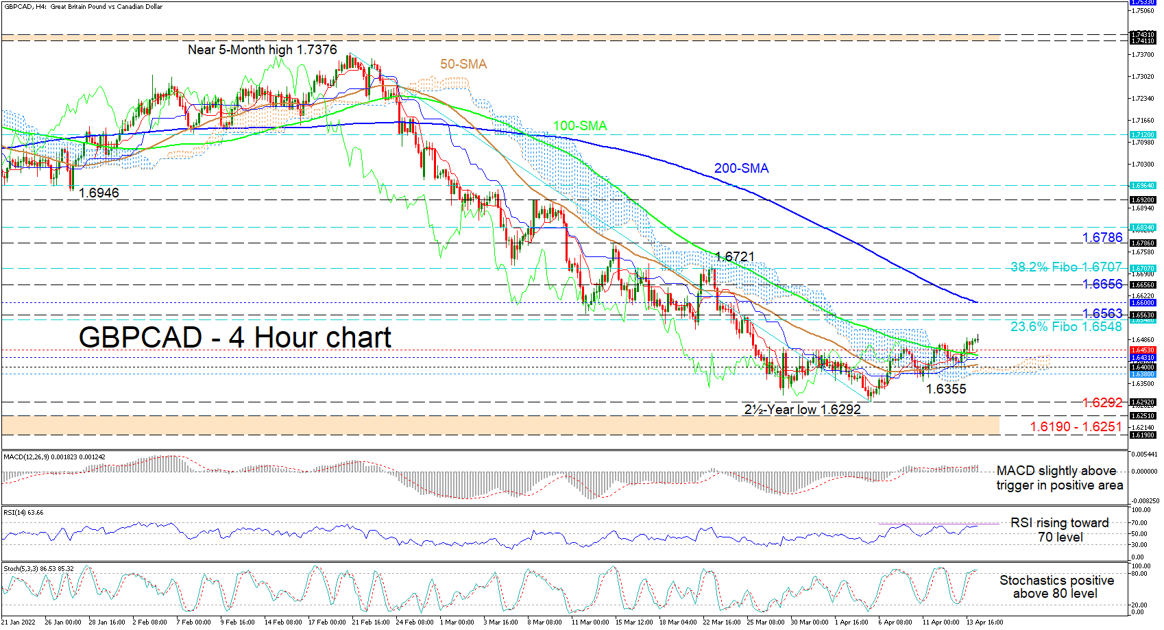 Summarizing, GBPCAD is exhibiting a positive vibe as the price is improving above the cloud and the 50- and 100-period SMAs. However, should the price remain beneath the 23.6% Fibo of 1.6548 and the 1.6563 high, risks to the downside may linger.