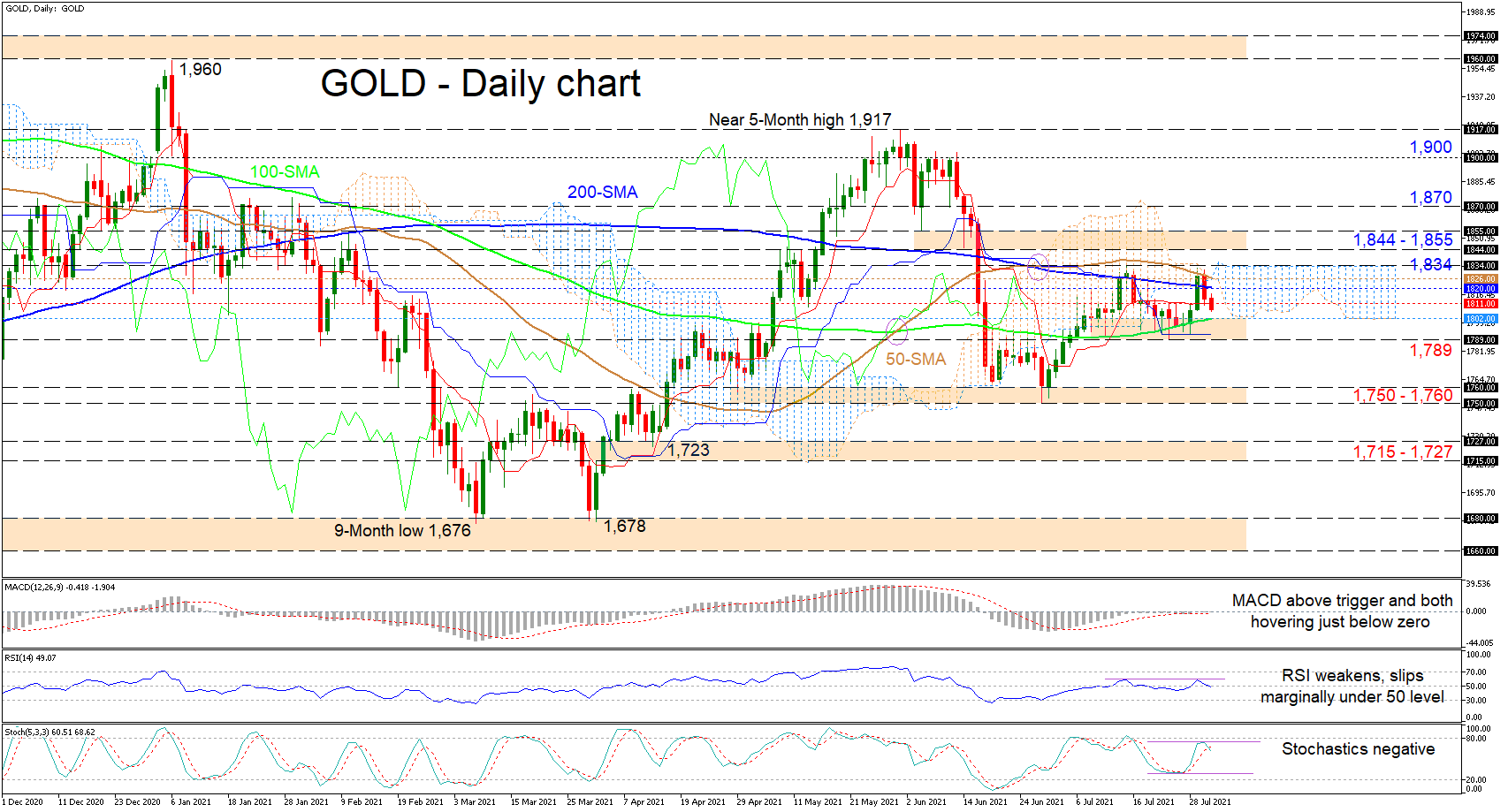 To the downside, if the price pushes clearly under the red Tenkan-sen line at 1,811, a tough support zone could arise from the 100-day SMA at 1,802 until the 1,789 obstacle. Should sellers manage to steer below this region, which is storing multiple lows, the yellow metal may then dive to challenge the base of 1,750-1,760, formed by the troughs on April 29, June 18 and 29. In the event downward pressures gain significant power, the support border of 1,715-1,727 could then come into play.