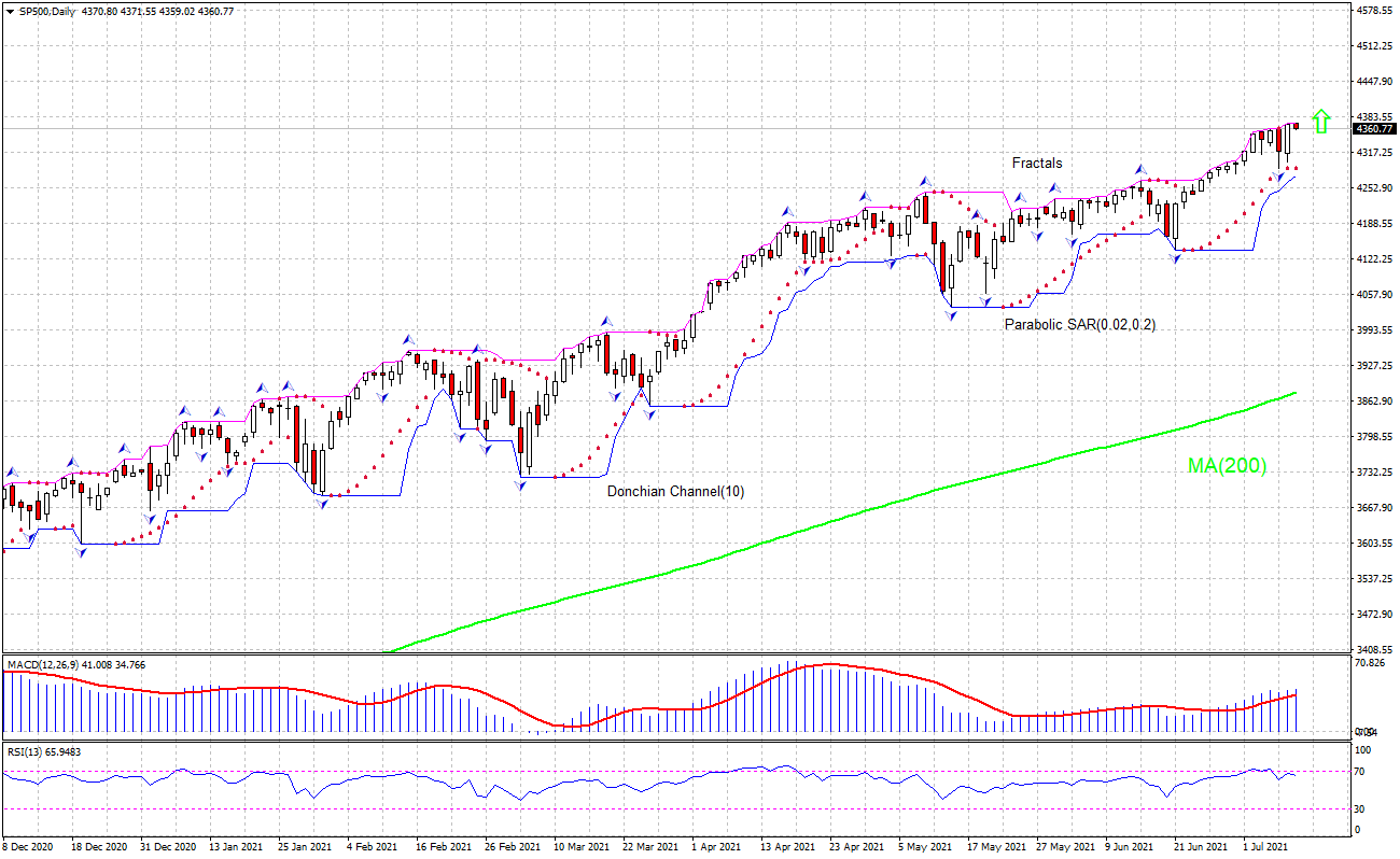 The technical analysis of the SP500 price chart in the daily timeframe shows SP500, Daily is retracing up after pulling back from the all-time high it hit in mid-June. It is above the 200-day moving average MA(200), which is rising. We believe the bullish momentum will continue after the price breaches above the upper boundary of Donchian channel at 4371.55. A level above this can be used as an entry point for placing a pending order to buy. The stop loss can be placed below 4274.03. After placing the order, the stop loss is to be moved every day to the next fractal low, following Parabolic signals. Thus, we are changing the expected profit/loss ratio to the breakeven point. If the price meets the stop loss level (4274.03) without reaching the order (4371.55), we recommend canceling the order: the market has undergone internal changes which were not taken into account.