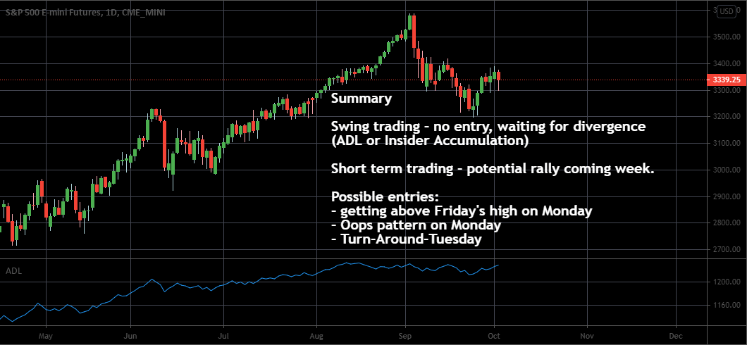 There is still no swing entry in SP500, but I feel we are getting close to it. Advance Decline Line and Insider Accumulation did an amazing job predicting all major moves. We want to wait till they speak again and hopefully, we will get divergence. For now, I focus on intraday and short-term trading. Based on cycles we can expect a rally this week. I can't predict price action, but I have a few scenarios on my mind: