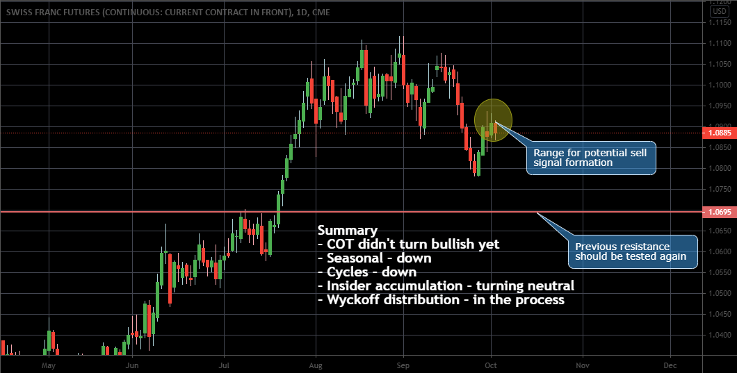 Swiss Franc futures dropped as it was forecasted. I think the decline is not over yet. We can see a small rally followed by the next wave down. The 1.0700 range was strong resistance and there is a big chance it will be tested again. Commercials are still short this market, seasonal tendency is to the downside. However, Insider Accumulation is turning neutral from bearish. With that in mind and a bit more cautious, we want to look for and take sell signals. Besides, Wyckoff distribution is in the process and we still can make money shorting Swiss Franc futures.