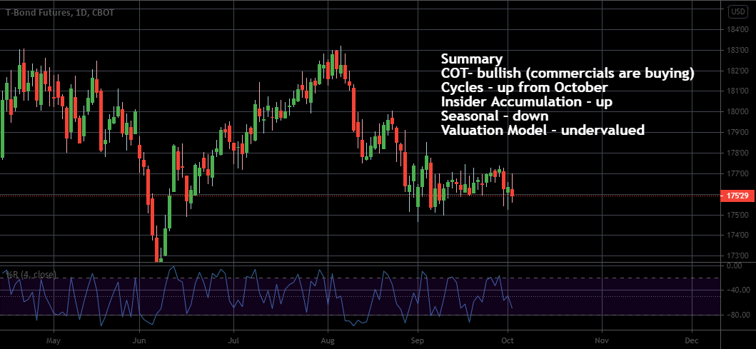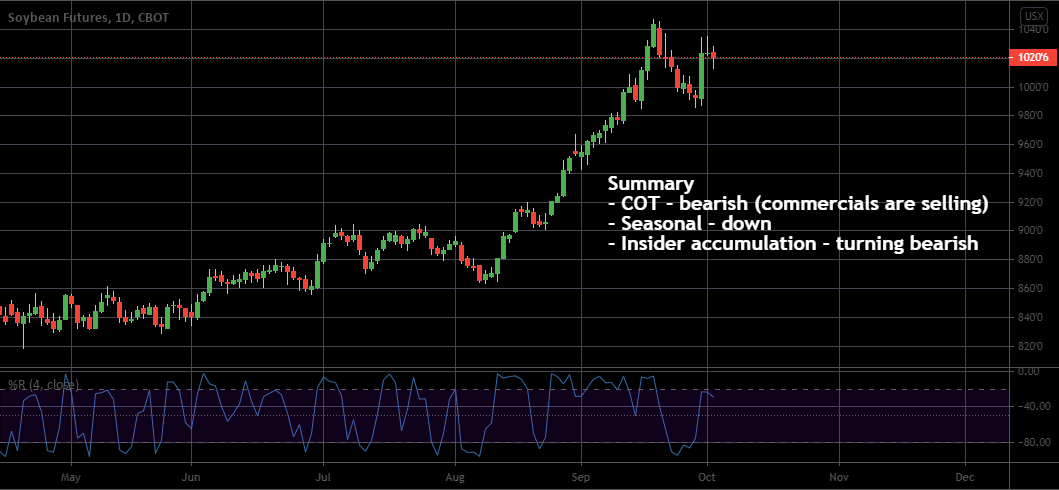 It has been a long time since my last Soybean forecast. It is time to pay attention to this market. It is setting up for the decline. Commercials are heavily selling, the seasonal tendency is to the downside, and Insider Accumulation is turning bearish. So, if on Monday we get below Friday's low, that will be a sell signal. However, it seems like it will take more time to form some pattern. We may see a very short-term rally followed by a sell signal formation. Don't hurry and wait for confirmation. We have a good setup, but timing matters a lot in this business.