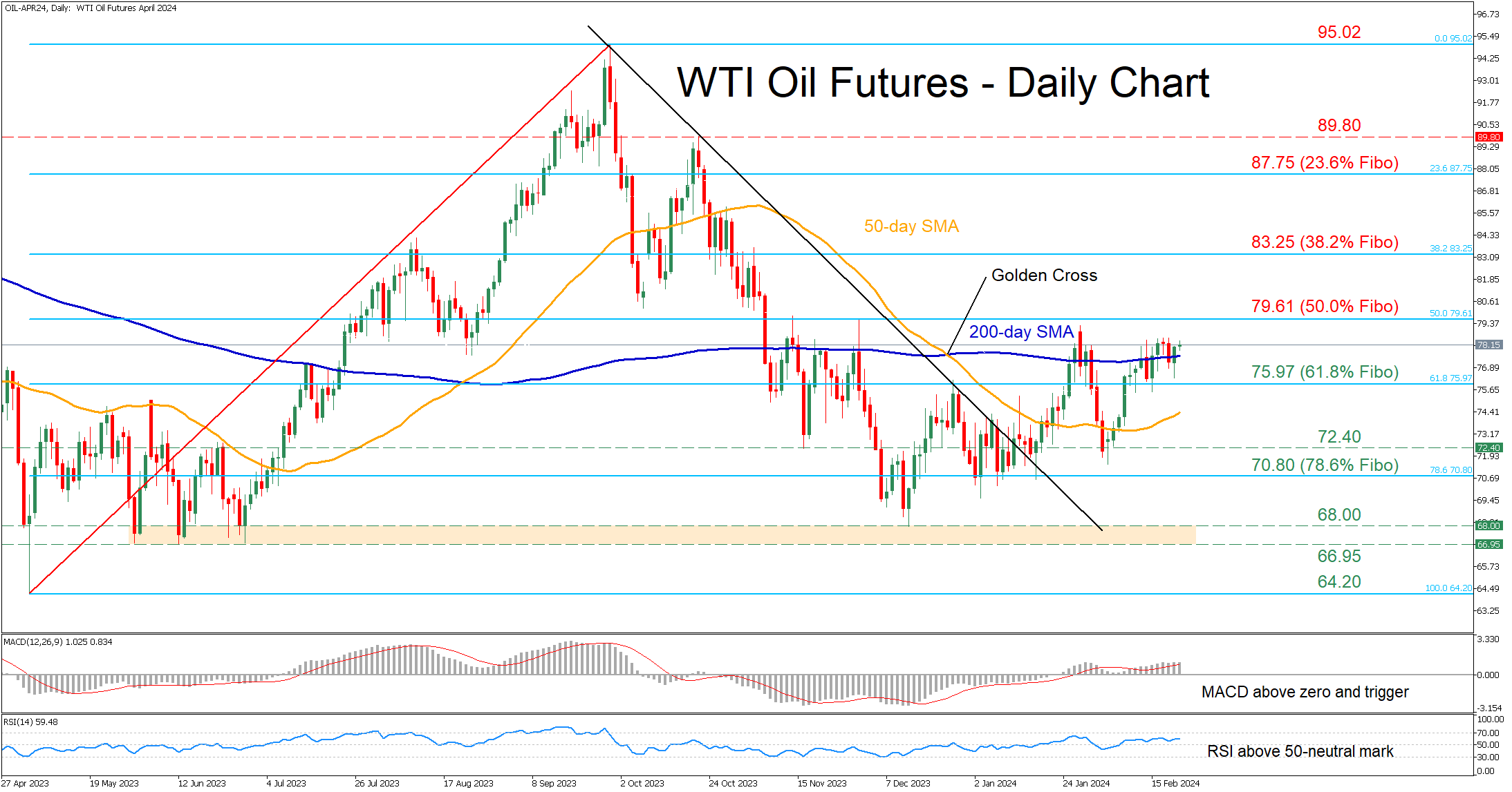 WTI oil futures (April delivery) have been staging a comeback following their break above the 50-day simple moving average (SMA) in early February. However, the recovery seems to be on hold for now as the 200-day SMA has been curbing the price’s upside.
