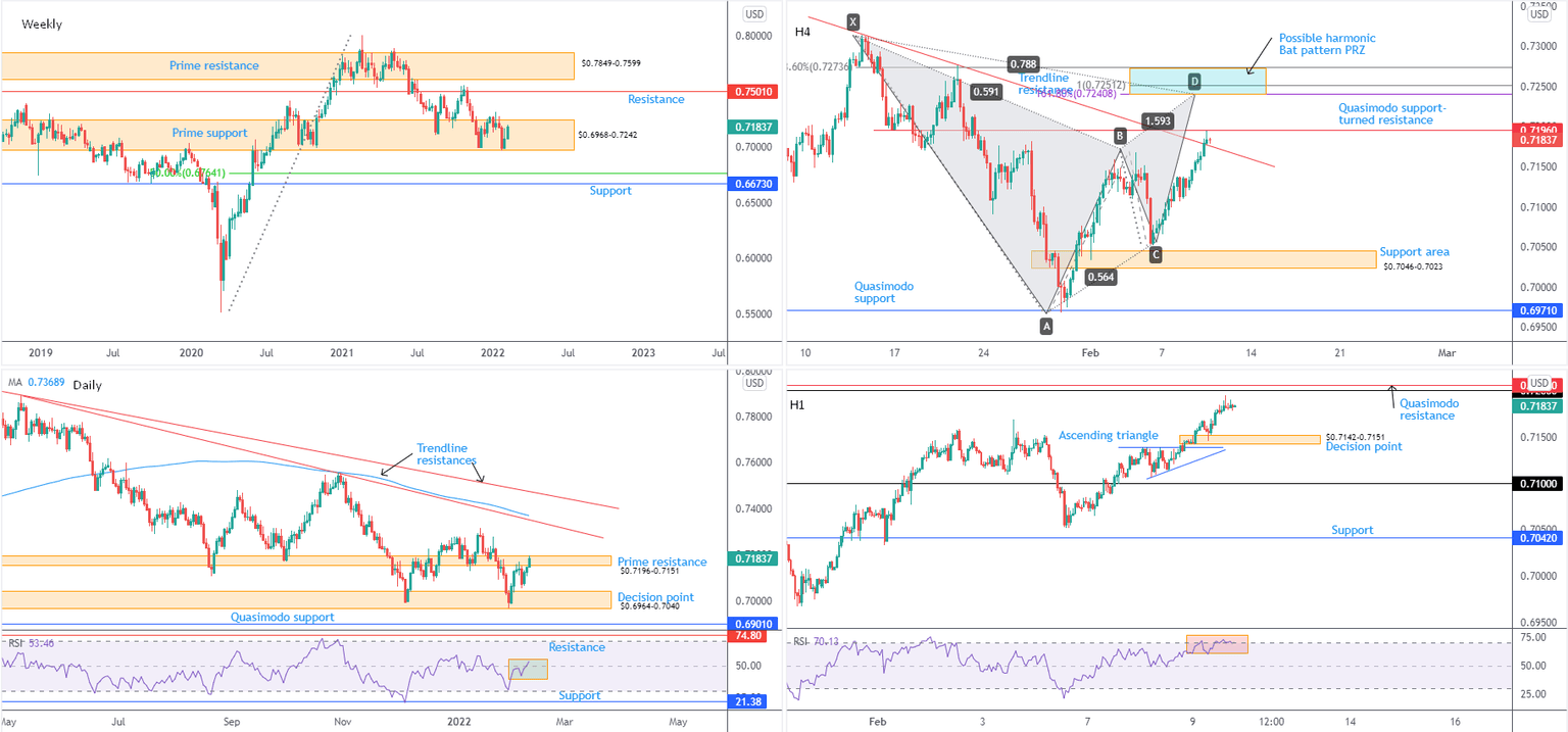 Technically, then, buyers appear to have the upper hand. The weekly timeframe showing strength within prime support at $0.6968-0.7242 and daily prime resistance seemingly hanging by a thread at $0.7196-0.7151 suggests a bullish vibe. This could lead to H1 climbing $0.72 and the H4 reaching for the harmonic Bat pattern’s PRZ between $0.7274 and $0.7241.