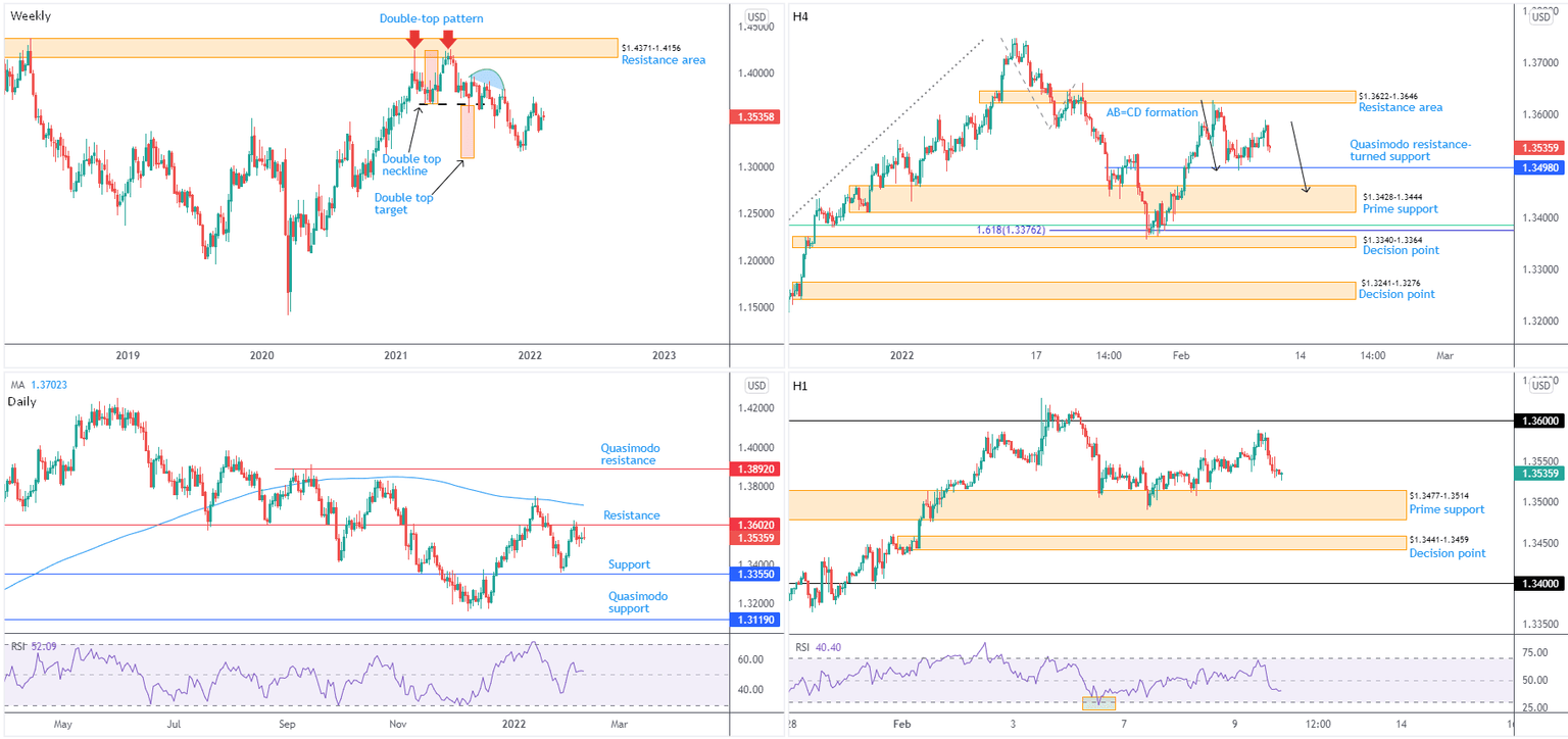 Technical observations draw attention to daily resistance at $1.3602, a base entering the fight at the tail end of last week. Weakness from here shines the technical spotlight on support at $1.3355, with follow-through downside perhaps throwing Quasimodo support into the mix at $1.3119. Of note, the aforementioned support shares chart space with the weekly timeframe’s double-top pattern’s ($1.4241) profit objective at $1.3090. If daily action moves above current resistance, traders are urged to pencil in the 200-day simple moving average at $1.3702.