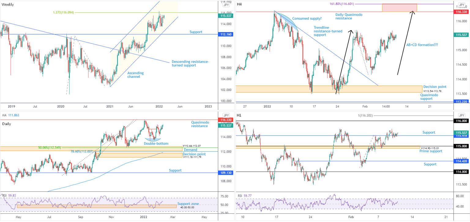 In addition to weekly and daily timeframes, H4 technical structure signals a potential AB=CD completion in the direction of daily Quasimodo resistance at ¥116.33 (black arrows). This is set close by a 1.618% Fibonacci extension at ¥116.60.