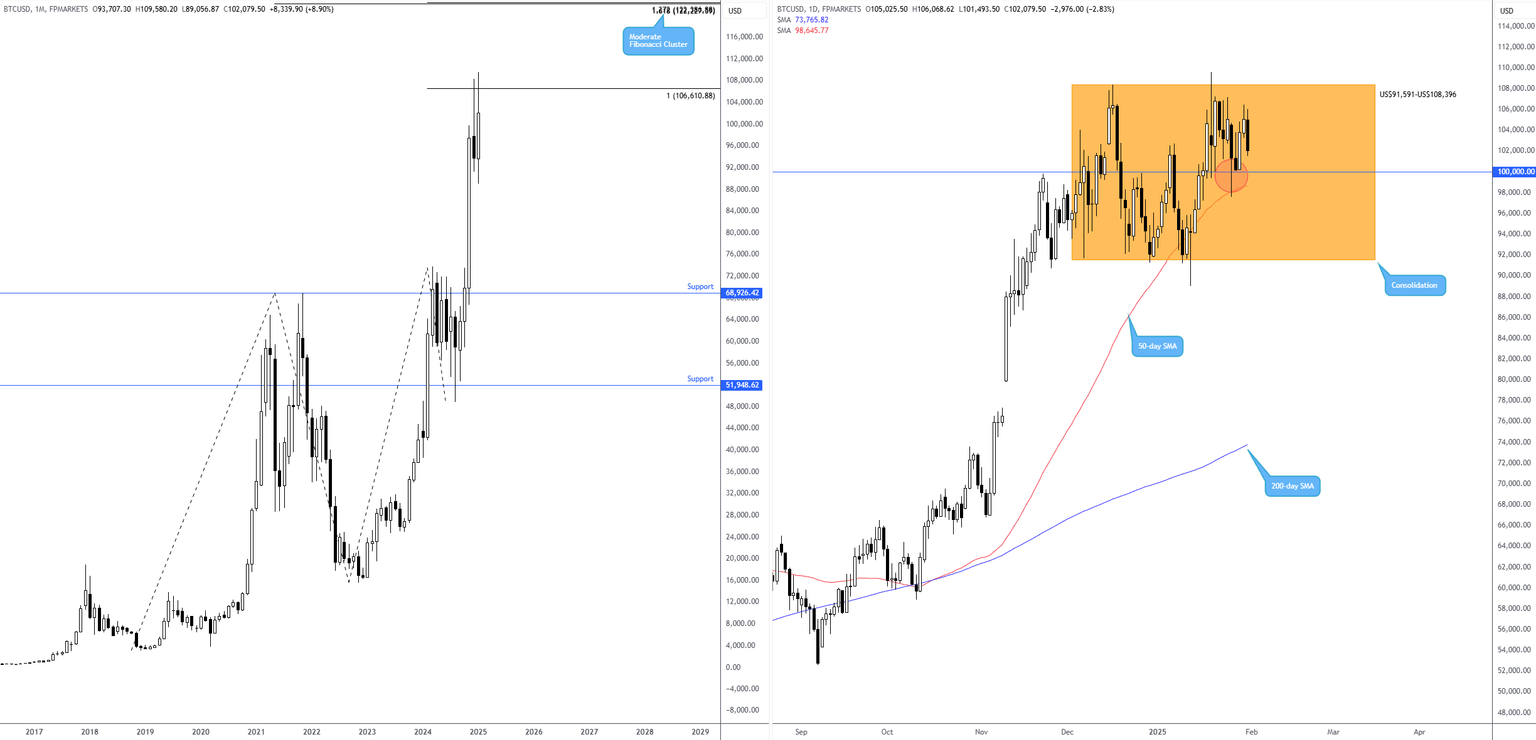 There is not much to talk about on the monthly chart right now except to remind ourselves that last year wrapped up touching the underside of a 100% projection ratio at US$106,610. While December 2024 delivered a half-hearted bearish shooting star pattern (I prefer these structures to have little to no lower shadow), January observed bulls return in force, ending the month up 9.0% and engulfing December’s range. Were buyers to pull things beyond US$106,610, the next logical upside target (for me, anyway) would be a moderate Fibonacci projection cluster at approximately US$122,000, consisting of 1.272% and 1.618% Fibonacci projection ratios.