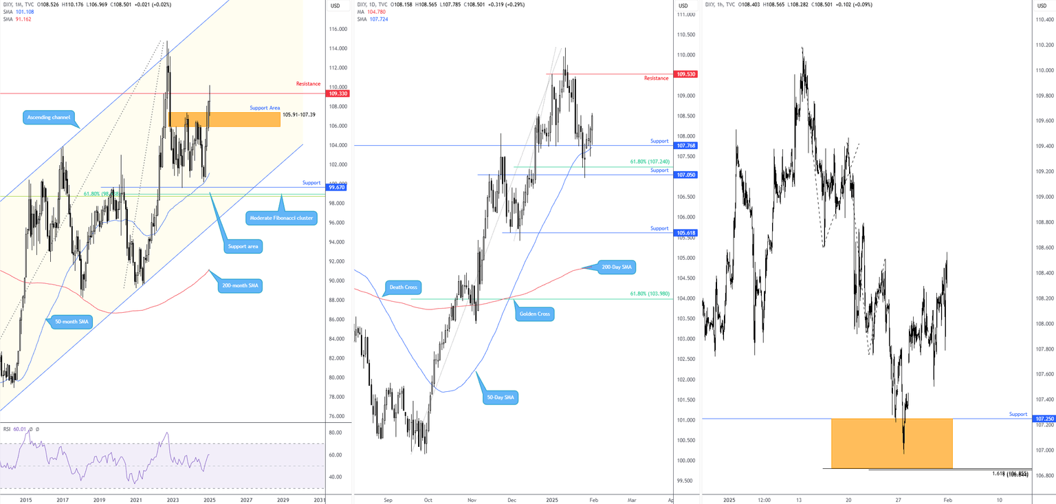 As evident from the charts below, the USD Index has run higher since and gained a foothold above 107.77 resistance on the daily timeframe, which, following the recent retest, I have marked support. With price north of 107.77, buyers may feel the ‘path of least resistance’ is now towards monthly resistance, coming in at 109.33, closely followed by daily resistance from 109.53.