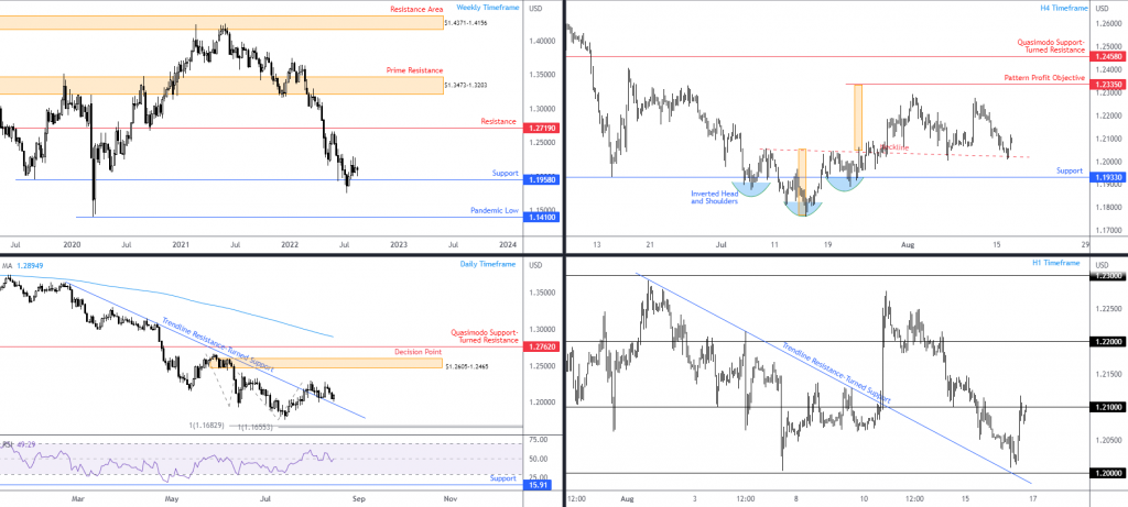 A decisive H1 close above $1.21 is likely enough to tempt breakout buying towards $1.22, in light of the space seen to move north on the weekly, daily, and H4 timeframes.